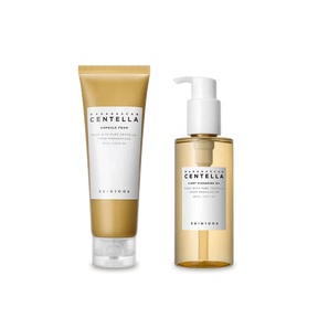 This Madagascar Centella Double Cleansing Duo Set includes: Madagascar Centella Light Cleansing Oil 200ml and Madagascar Centella Ampoule Foam 125ml. The Light Cleansing Oil is a gentle, multifunctional cleanser that effortlessly removes all makeup using MCT Oil from coconut and six botanical oils to soothe skin. It purifies pores with a lightweight, refreshing finish and employs micellar technology to cleanse while moisturizing. The Ampoule Foam, enriched with 84% Centella Asiatica Extract, calms and hydrates irritated skin. It deeply cleanses pores with baking soda and coconut oil, using EWG green-grade ingredients ideal for sensitive skin. Use the foam in the morning for light cleansing and the oil in the evening to remove makeup and impurities thoroughly.